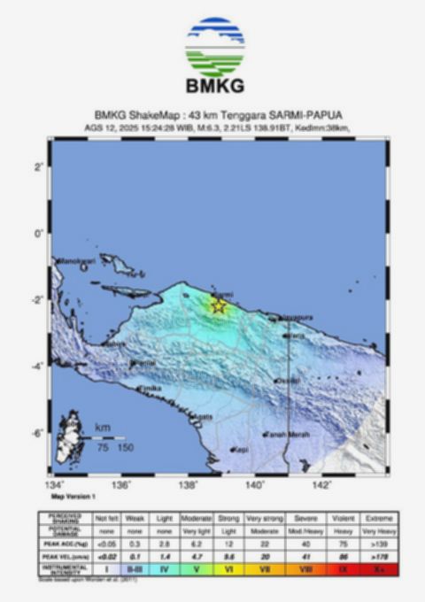 Getaran kuat melanda wilayah Sarmi, Papua, pada Selasa, 12 Agustus, pukul 15.24.24 WIB, ketika gempa bumi bermagnitudo 6,3 mengguncang. Badan Meteorologi, Klimatologi, dan Geofisika (BMKG) segera memastikan bahwa gempa ini tidak berpotensi menimbulkan tsunami.